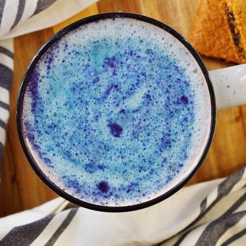Nakonec pomalu nalijte čaj přes lžičku nebo bok sklenice – vznikne nádherné modré latte s pastelovým efektem.