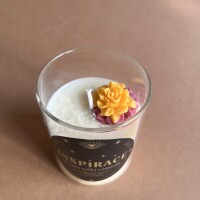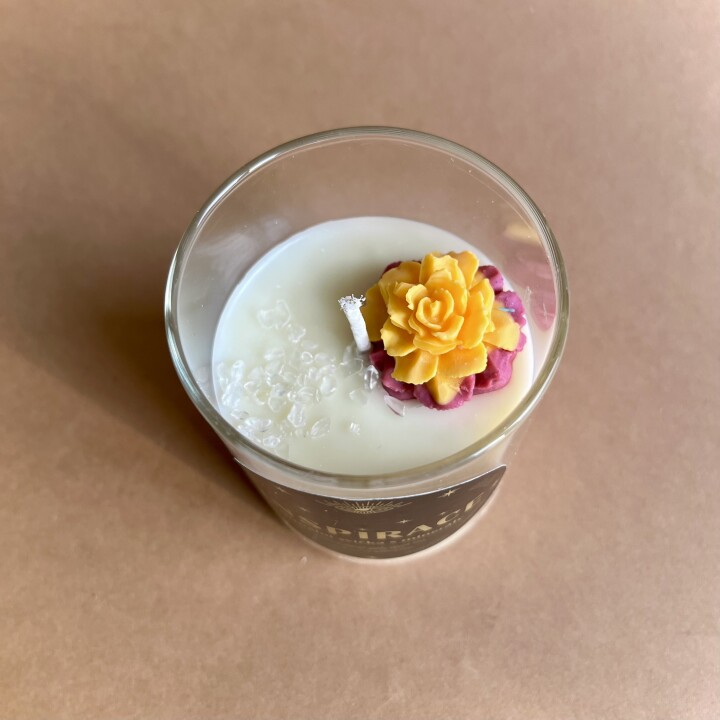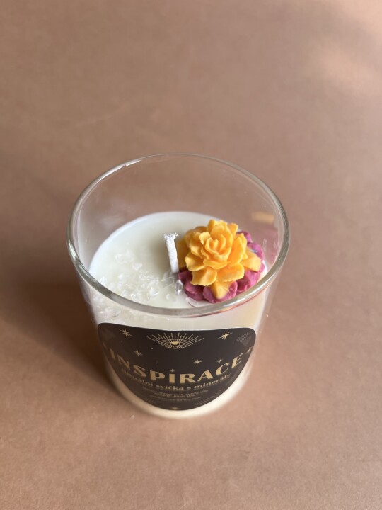 Vonná svíčka ze sójového vosku s krystalovým pískem a voskovou kytičkou – Inspirace