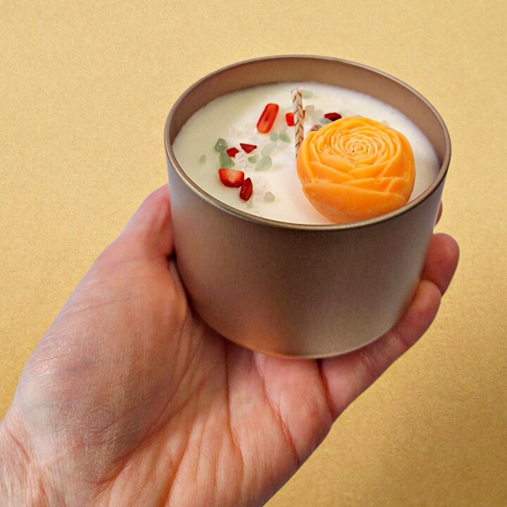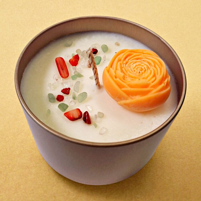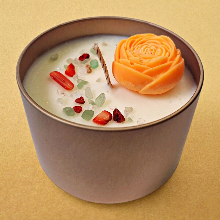 Tato ručně vyráběná svíčka ze 100% přírodního sójového vosku je ozdobena jemným krystalovým citrínovým pískem a dekorativní voskovou kytičkou, která dodává každému kousku jedinečný vzhled.