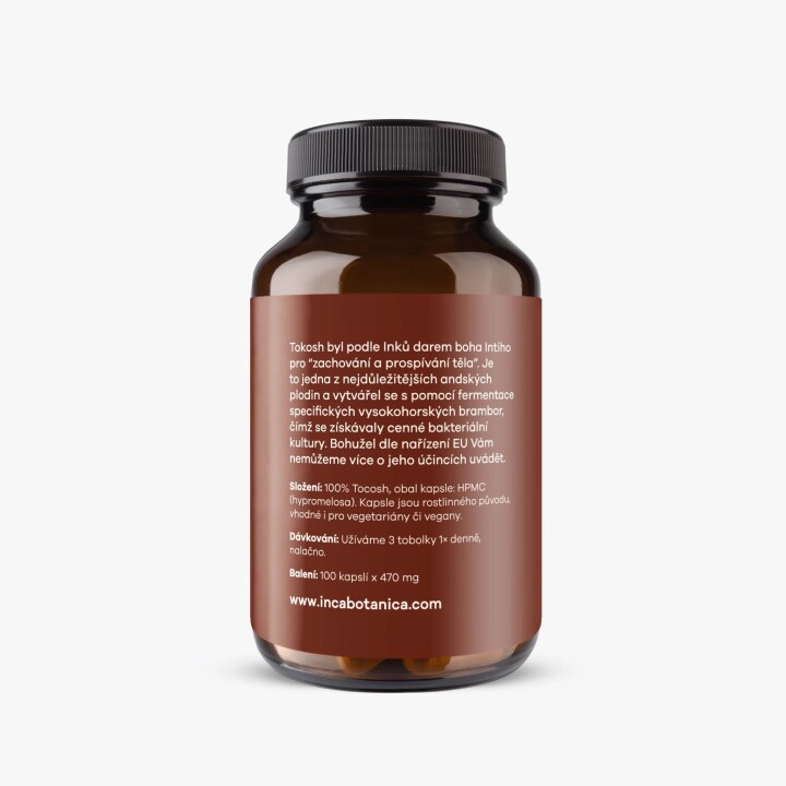 Složení: 100% Tocosh, 470 mg/tobolka, obal kapsle: HPMC (hypromelosa). Kapsle jsou rostlinného původu, vhodné i pro vegetariány či vegany.
