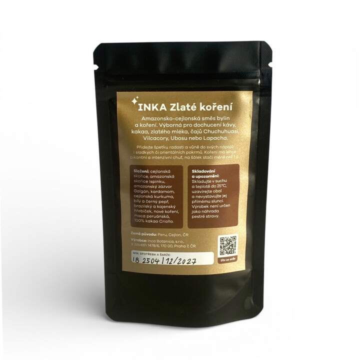 Složení: cejlonská skořice, amazonská skořice Ispinku, amazonský zázvor Galgan, kardamom, cejlonská kurkuma, bílý a černý pepř, brazilský a kajenský hřebíček, nové koření, Maca peruánská, Criollo kakao.
