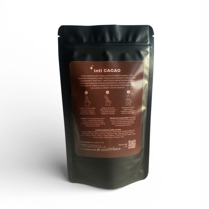 Pravé ceremoniální kakao ve formě sypkého prášku s 12% obsahem kakaového másla. Tento vzácný ekotyp Criollo pochází z posvátného údolí Inků v okolí Cusca, kde jej dodnes pěstuje kmen Machiguenga.